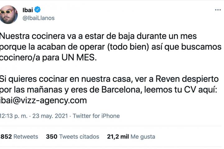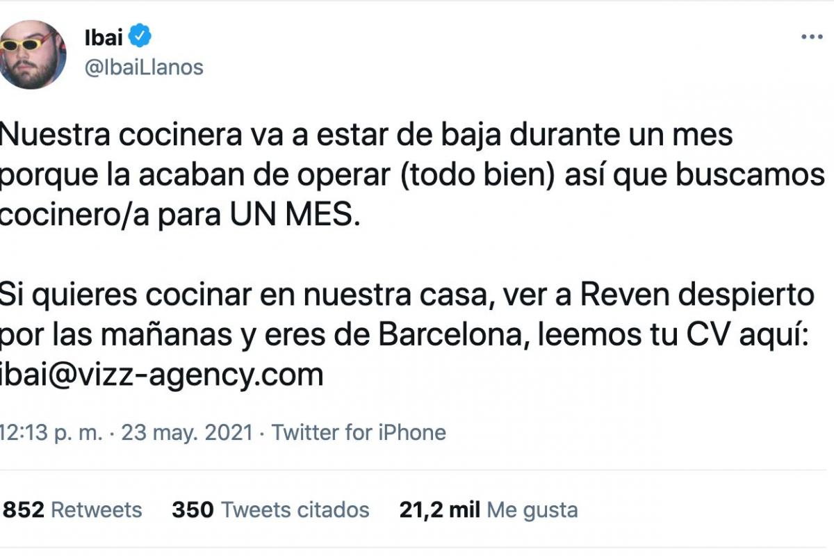 Nuestra cocinera va a estar de baja durante un mes porque la acaban de operar (todo bien) así que buscamos cocinero/a para UN MES. Si quieres cocinar en nuestra casa, ver a Reven despierto por las mañanas y eres de Barcelona, leemos tu CV aquí: ibai@vizz-agency.com”, ha escrito Ibai en Twitter.