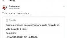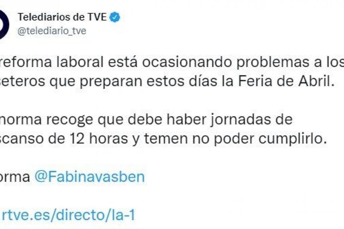 Con ello, el Telediario de Televisión Española abordó este asunto y lo hizo de una forma muy criticada en Twitter. “La reforma laboral está ocasionando problemas a los caseteros que preparan estos días la Feria de Abril”, escribieron en uno de sus tuits. “La norma recoge que debe haber jornadas de descanso de 12 horas y temen no poder cumplirlo”, añadían.