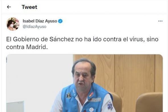 “El Gobierno de Sánchez no ha ido contra el virus, sino contra Madrid”, ha escrito la dirigente del PP junto a un enlace a una noticia de Telemadrid titulada: “El Summa 112 ofreció a AENA realizar test en Barajas pero el Ministerio de Sanidad no les contestó”.