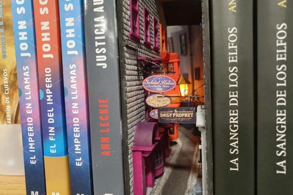 El tercer protagonista es el escritor Jesús Gordillo, quien tras ver que un artista japonés (@monde55212068) hacía separadores similares pero no los vendía en España se le ocurrió pedirle a su amigo que le recrease el Callejón Diagon de Harry Potter. Quería regalarlo por Navidad. “Fue el primero que hice, luego una amiga suya me encargó otro y creé uno inspirado en el corto El Viaje a la Luna de Georges Méliès”, cuenta humildemente este pacense, para el que las manualidades han sido siempre un hobbie sin más repercusión.