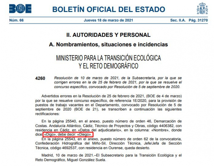 Esta es la descripción del fallo y su posterior corrección: “En la página 25.540, en el anexo, puesto número de orden 46, Demarcación de Costas. Andalucía Atlántico, Cádiz, Técnico de Proyectos y Obras, código 4406382, con residencia en Cádiz, en ‘Datos del adjudicatario’, en la columna: ‘Nombre’, donde dice: ‘Digo’, debe decir: ‘Diego’”.