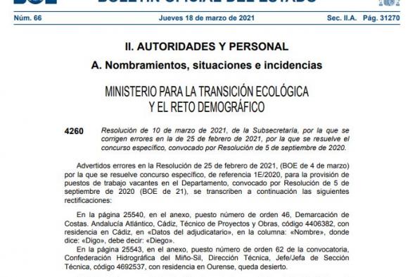 Esta es la descripción del fallo y su posterior corrección: “En la página 25.540, en el anexo, puesto número de orden 46, Demarcación de Costas. Andalucía Atlántico, Cádiz, Técnico de Proyectos y Obras, código 4406382, con residencia en Cádiz, en ‘Datos del adjudicatario’, en la columna: ‘Nombre’, donde dice: ‘Digo’, debe decir: ‘Diego’”.