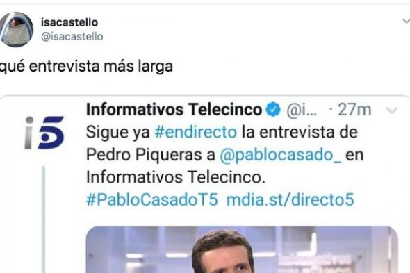 En redes, lo que más ha llamado la atención de la entrevista es una anécdota. La cuenta de Twitter de Informativos Telecinco empezó a publicar algunas frases de la entrevista. Pero, justo en el primer mensaje, acompañaron el texto con una foto de otra visita de Pablo Casado al plató. Cuando todavía no se había dejado barba.