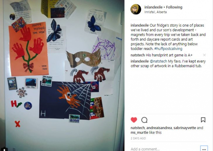 "La historia de nuestro frigorífico es la de los sitios en los que hemos vivido y la del crecimiento de nuestro hijo, con imanes de los lugares que visitamos una y otra vez, con informes de la guardería y con las obras de arte de nuestro hijo. Daos cuenta de que no hay objetos por debajo del alcance de nuestro pequeño", escribe la usuaria inlandexile en Instagram.