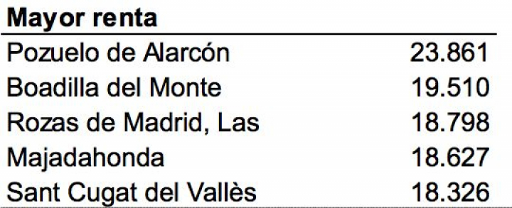 La riqueza suele concentrarse. De hecho, las cuatro poblaciones con mayor renta están ubicadas en la misma zona geográfica: el noroeste de Madrid, en torno a las carreteras A-6 y M-50. Después de Pozuelo, se encuentran los municipios de Boadilla del Monte (renta media de 19.510 euros), Las Rozas de Madrid (18.798 euros) y Majadahonda (18.627 euros).