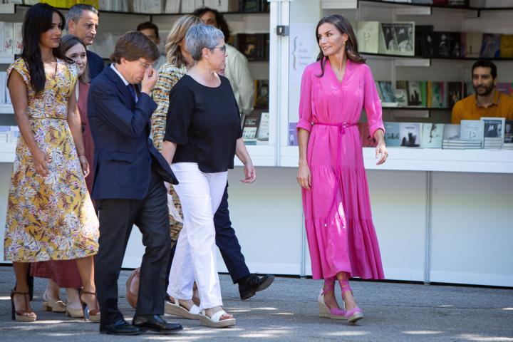 Vestida con un diseño boho de color fucsia y alpargatas a juego, y acompañada por la ministra de Cultura, Pilar Alergía, la consejera de Cultura de la Comunidad de Madrid, Marta Rivera, el alcalde José Luis Martínez Almeida, la vicealcaldesa de la ciudad, Begoña Villacís, la reina ha visitado algunos de las casetas de la feria y se ha mostrado interesara por numerosas obras.