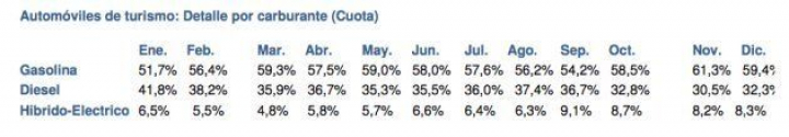 Así han evolucionado las ventas de coches por tipo de carburante a lo largo del año: