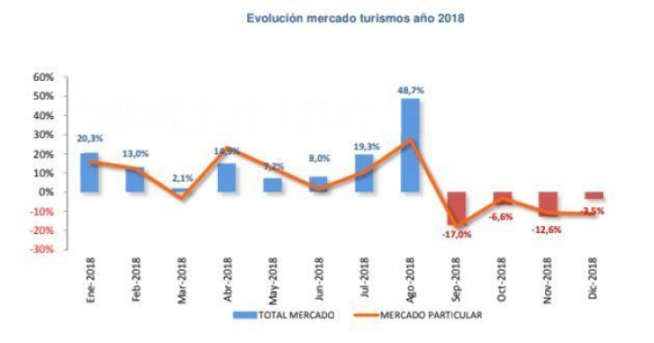 A pesar de ser un año positivo, el mercado español ha encadenado cuatro meses de caídas consecutivas. La principal razón de estas disminuciones en las ventas ha sido la entrada en vigor de la nueva normativa de medición de emisiones (WLTP) el pasado 1 de septiembre. Muchos consumidores decidieron adelantar la compra de vehículos a los meses de verano y los concesionarios han tenido menos afluencia en los últimos meses del año.