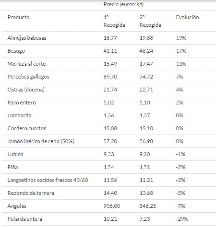 Por el contrario, el alimento que más ha bajado de precio en las últimas dos semanas es la pularda, con una caída del 29%.Le siguen las angulas y el redondo de ternera, que bajan un 7% y un 5%, respectivamente.