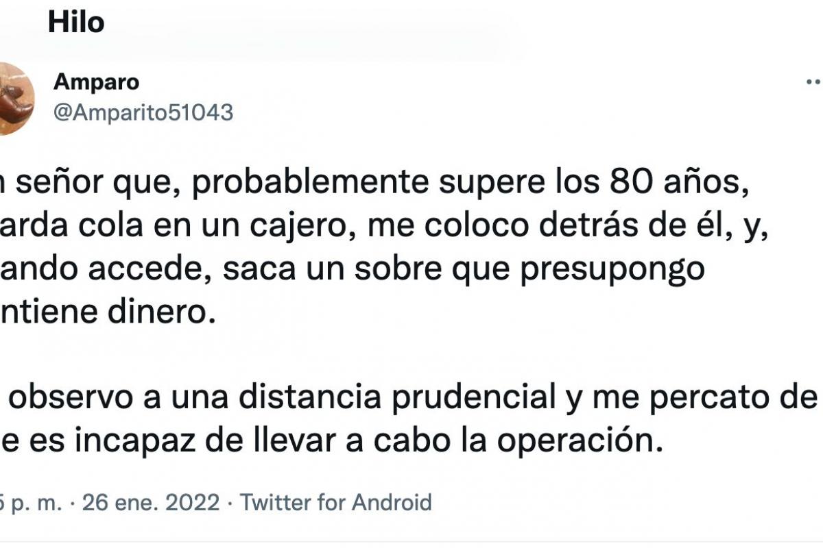 Ha explicado la tuitera que, mientras aguardaba para hacer sus gestiones se ha encontrado a un señor de unos 80 años que intentaba hacer un ingreso en efectivo.