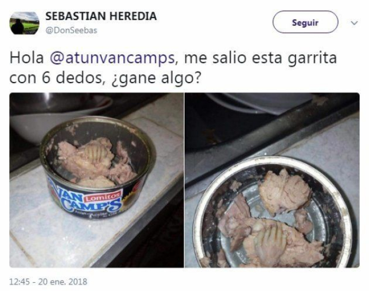Lo que hizo él fue escribir directamente a la empresa Atún Van Camps para pedirles explicaciones. "Hola, me salió esta garrita con 6 dedos, ¿gané algo?", ironizó.