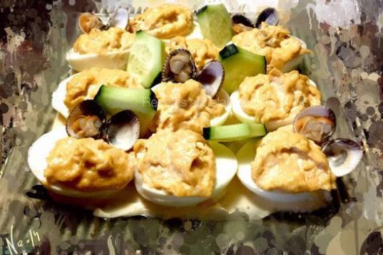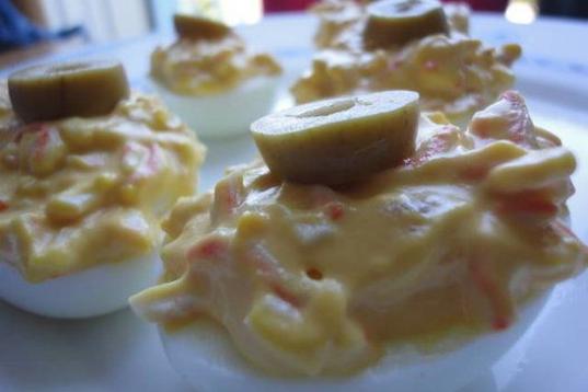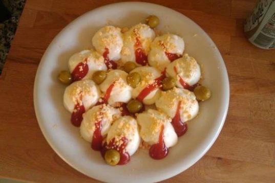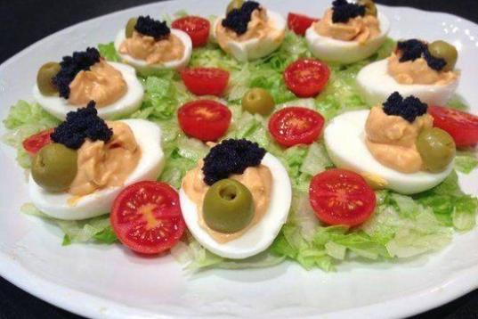 Las aceitunas son rellenas de anchoa y se decoran con sucedáneo de caviar y tomates cherry. La salsa lleva tabasco. Para prepararlos sigue la receta de Cookpad.