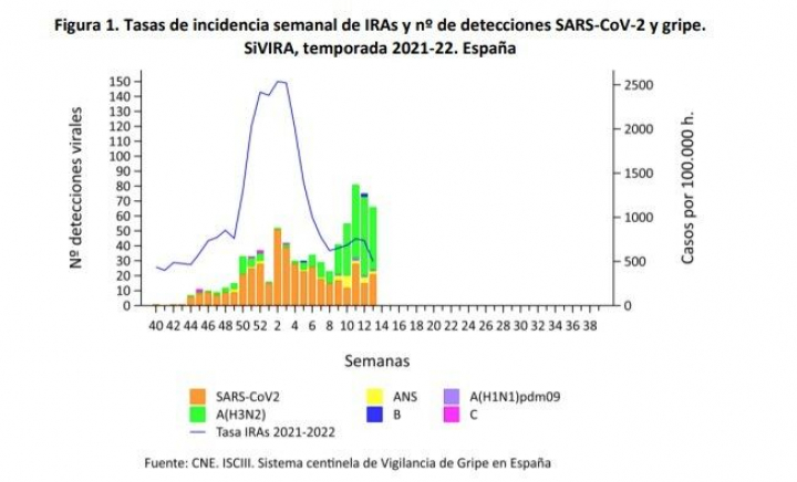Así se desprende del último Informe Semanal de Vigilancia de Infección Respiratoria Aguda (Sivira) publicado el 7 de abril que engloba conjuntamente la de la gripe, el SarS-CoV-2 (virus de la covid-19) y el virus respiratorio sincitial (VRS).