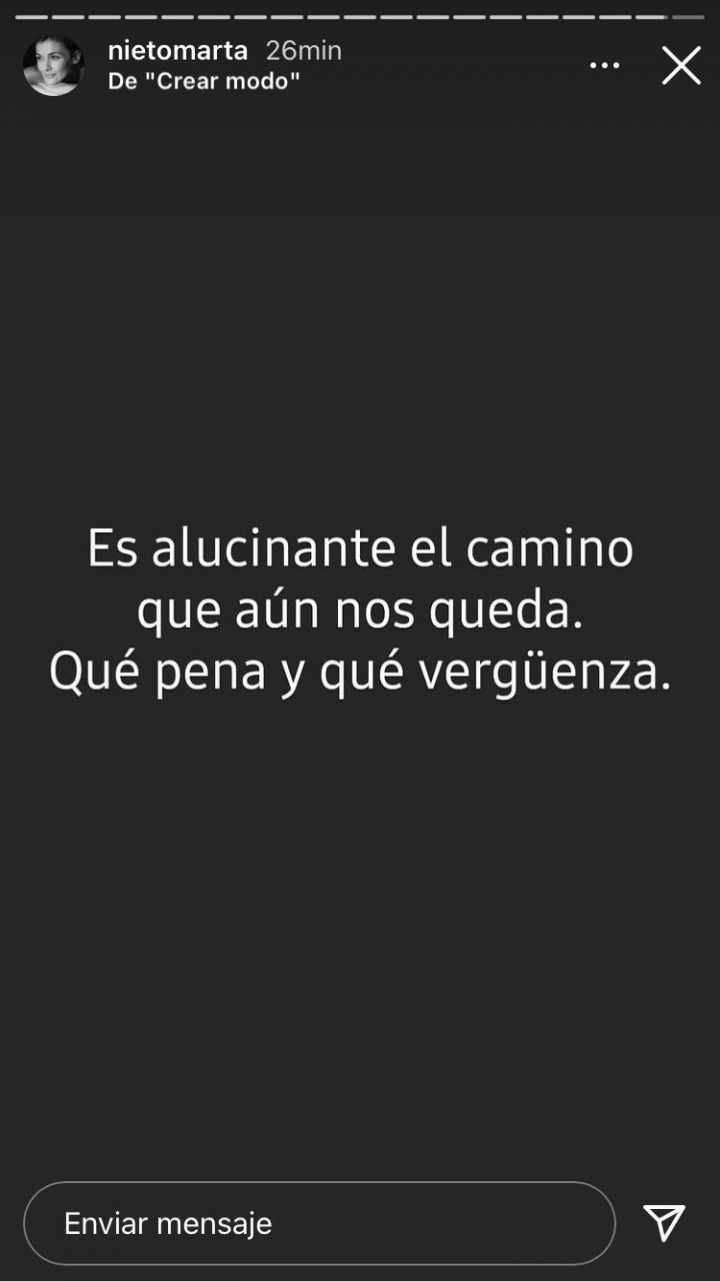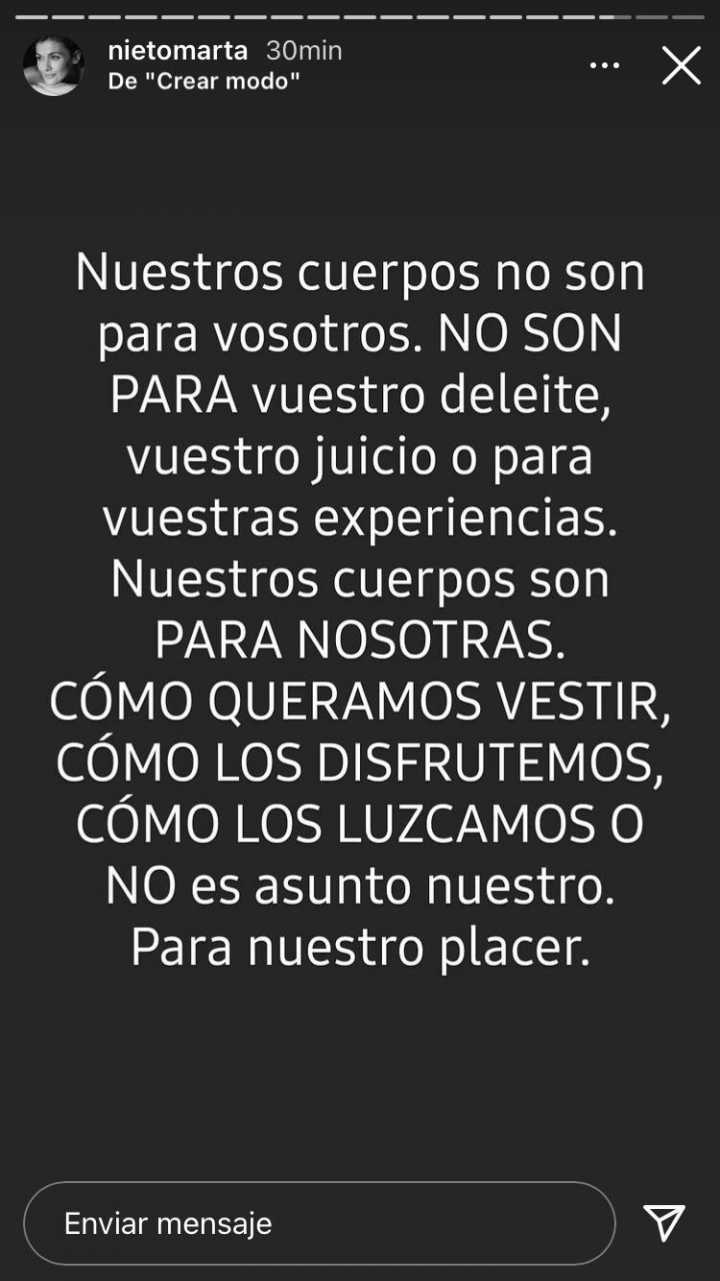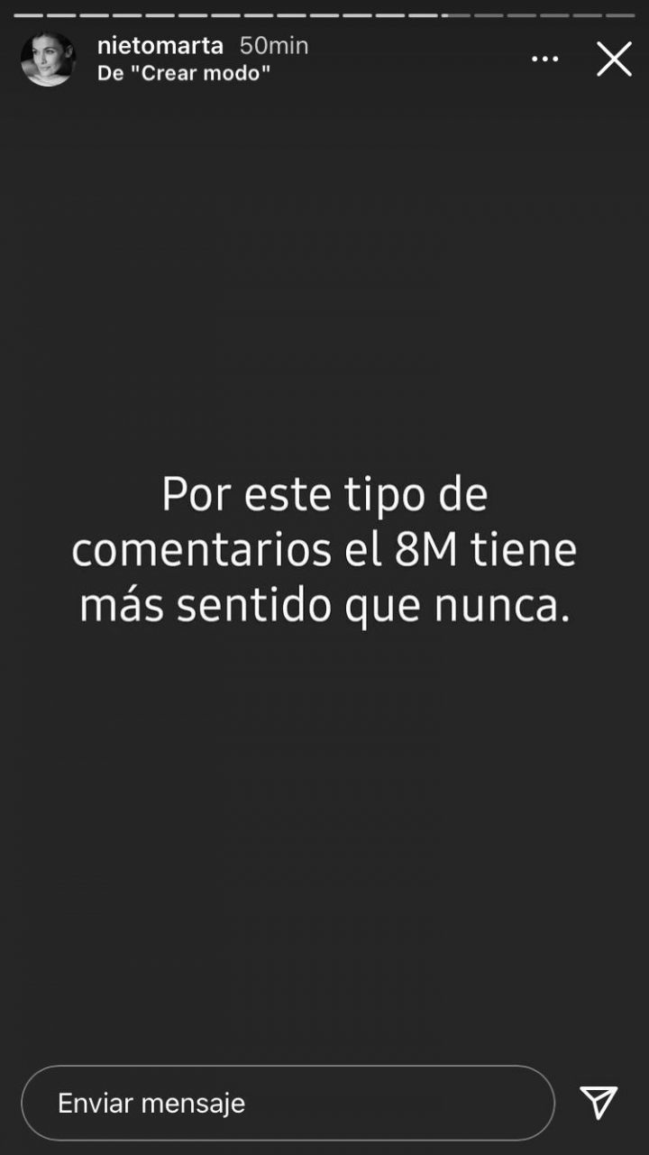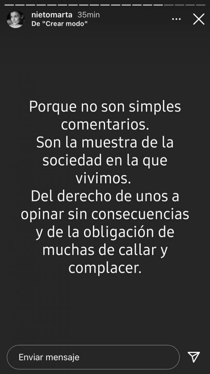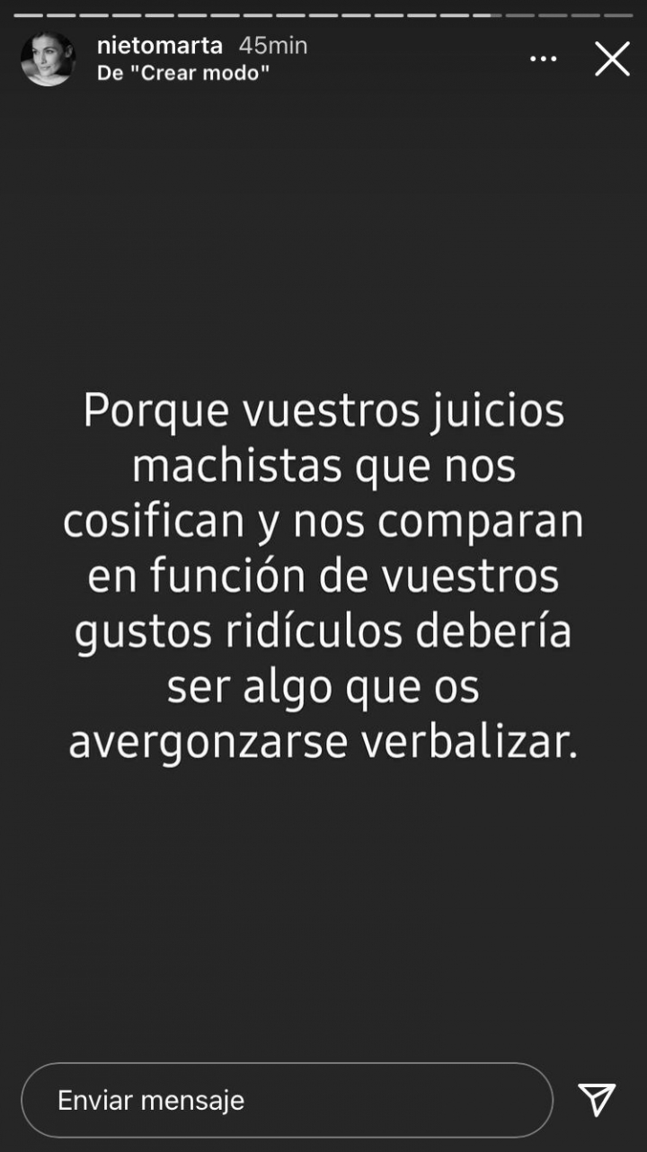 Desde sus ‘stories’ de Instagram, la propia Marta Nieto ha contestado a estos comentarios machistas, asegurando querer “gritar de rabia” por unos comentarios que “son la muestra de la sociedad en la que vivimos”.