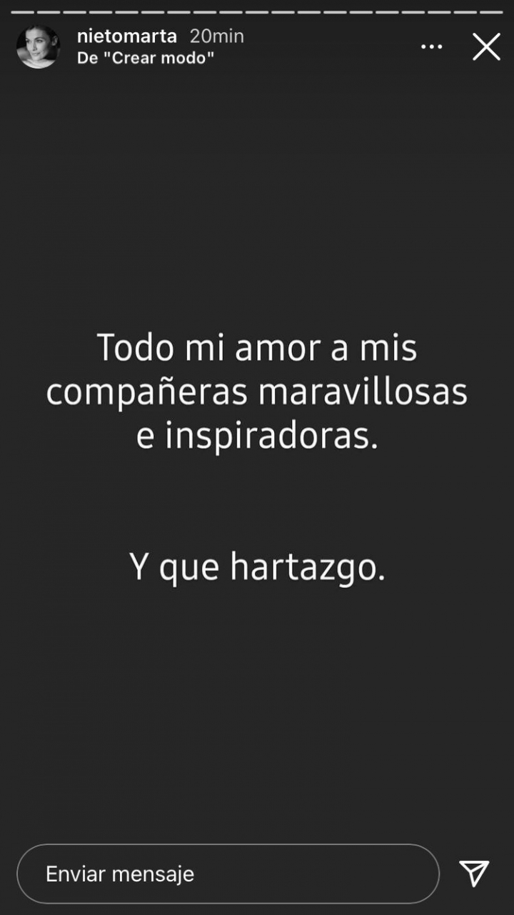 “Es alucinante el camino que aún nos queda. Qué pena y qué vergüenza”, se queja al final de sus mensajes, en los que manda todo su “amor” a sus “compañeras maravillosas e inspiradoras”. “Y qué hartazgo”, concluye.