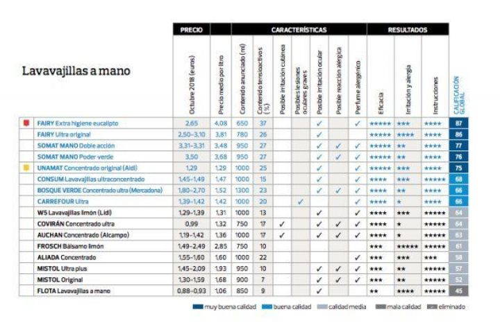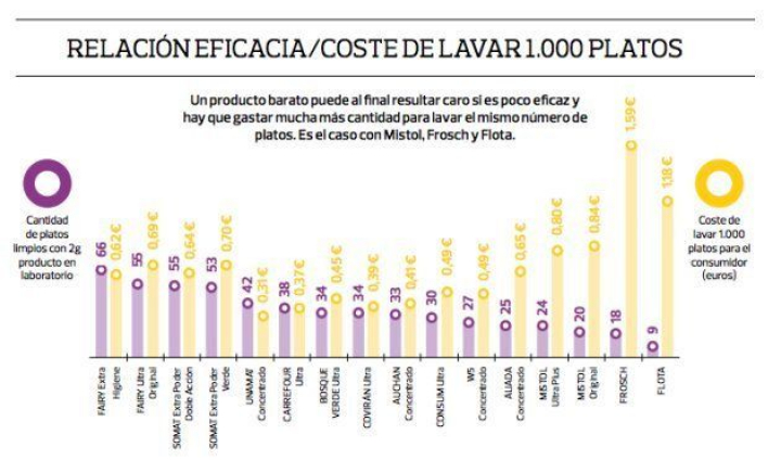 Sin embargo, este producto obtiene la mejor relación entre el precio y la eficacia del mismo, debido a su gran capacidad de lavado. "El porcentaje de tensioactivos [encargados de producir la espuma] es el más alto del análisis, lo que seguramente explica su gran poder de lavado: 66 platos", aseguran desde la OCU.