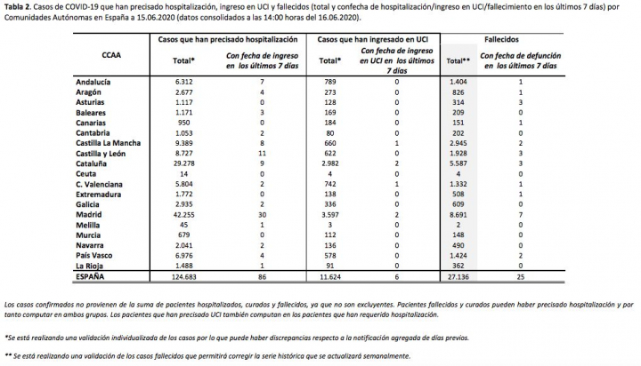 También Madrid encabeza los datos de nuevos positivos, con más de la mitad de los conocidos en 24 horas (42 de los 76). Únicamente Cataluña supera la decena además de Madrid. El resto oscila entre los tres contagiados de Baleares y los cero de La Rioja, Comunidad Valenciana, Murcia, Ceuta y Melilla.