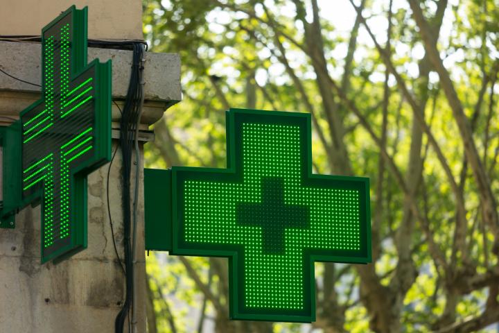 Closeup of a green pharmacy sign outside a pharmacy store in France.SanderStock via Getty Images