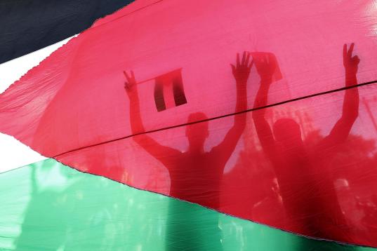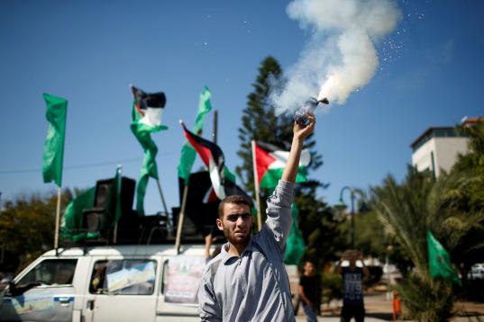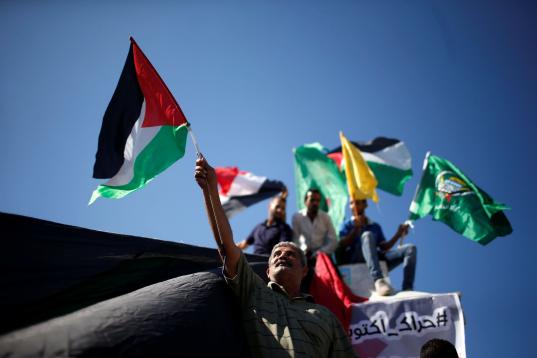 Un grupo de palestinos celebran en Gaza el acuerdo de Hamás y Fatah, con banderas de su estado y de los dos partidos.Suhaib Salem / REUTERS