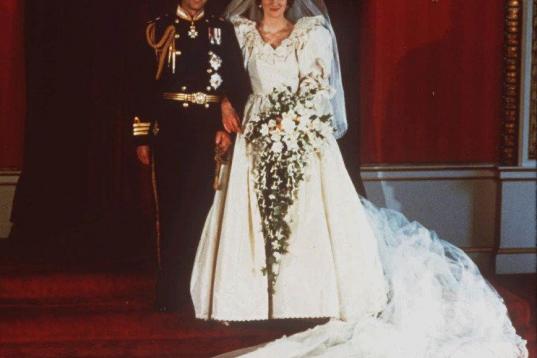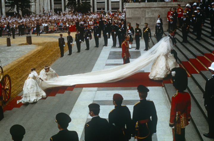 Diana Spencer lució en la boda, celebrada el 29 de julio de 1981 en la londinense catedral de Saint Paul, un voluminoso vestido blanco diseñador por los casi desconocidos diseñadores David Emanuel y su esposa Elizabeth.