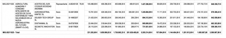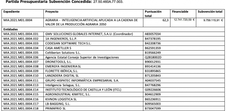 Además, esta empresa está entre las beneficiarias por el proyecto de Inteligencia Artificial aplicada a la cadena de valor de la producción agraria 2050, que consta en la convocatoria Misiones de I+D en IA, del Ministerio de Economía. Se trata de una iniciativa coordinada por GMV y participada por un consorcio de 24 socios, con 9,9 millones de euros. Del total, según fuentes gubernamentales, Kimitec recibe 1,3 millones de euros.