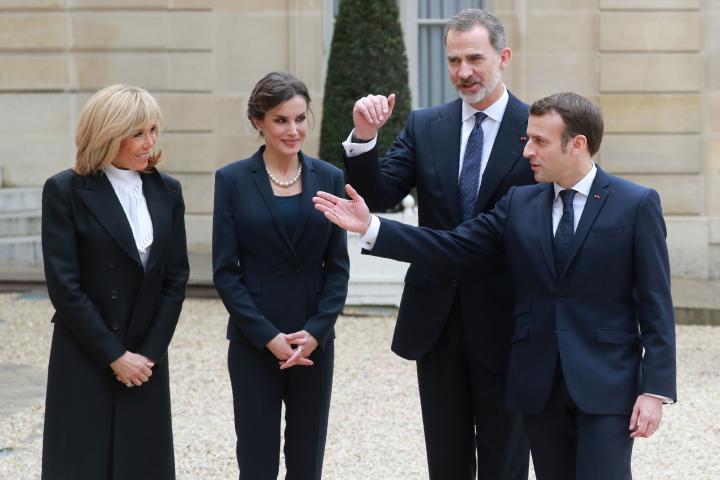 El presidente francés, Emmanuel Macron, y su esposa, Brigitte, recibieron este miércoles a los reyes de España en el Palacio del Elíseo, sin que se estrecharan la mano ni se besaran de acuerdo a las medidas de prevención establecidas ante la expansión del coronavirus.
