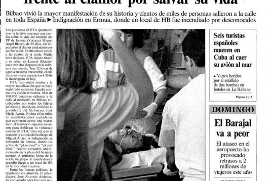 “Venir a Ermua el 14 de julio de 1997... nunca podré olvidar cada instante de aquel día. Como todos los españoles que amamos la vida y la libertad, estaba consternado, conmovido, desolado. Yo tenía entonces 29 años, la misma edad que Miguel Ángel Blanco cuando lo asesinaron”, ha recordado el monarca.