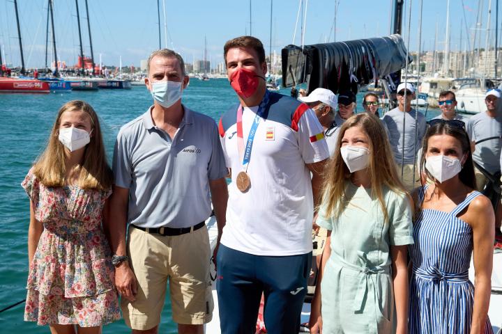 Los reyes Felipe VI y Letizia y sus hijas, la princesa Leonor y la infanta Sofía, han asistido este sábado al acto de bienvenida en Palma al regatista balear Joan Cardona a su regreso a España con la medalla de bronce conquistada en la clase Finn de los Juegos Olímpicos de Tokio.