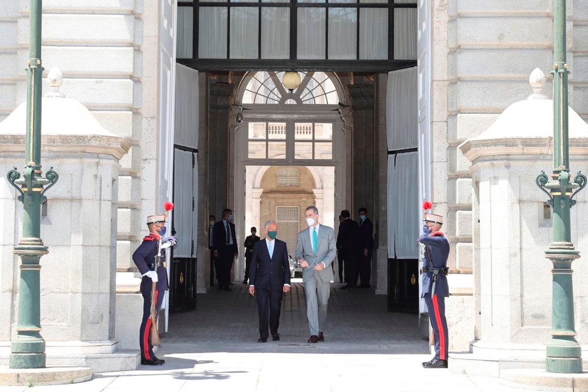 El rey Felipe VI ha recibido en visita oficial al presidente de Portugal, Marcelo Rebelo de Sousa, se han reunido este viernes en el Palacio Real, en un encuentro al que también ha asistido la reina Letizia.