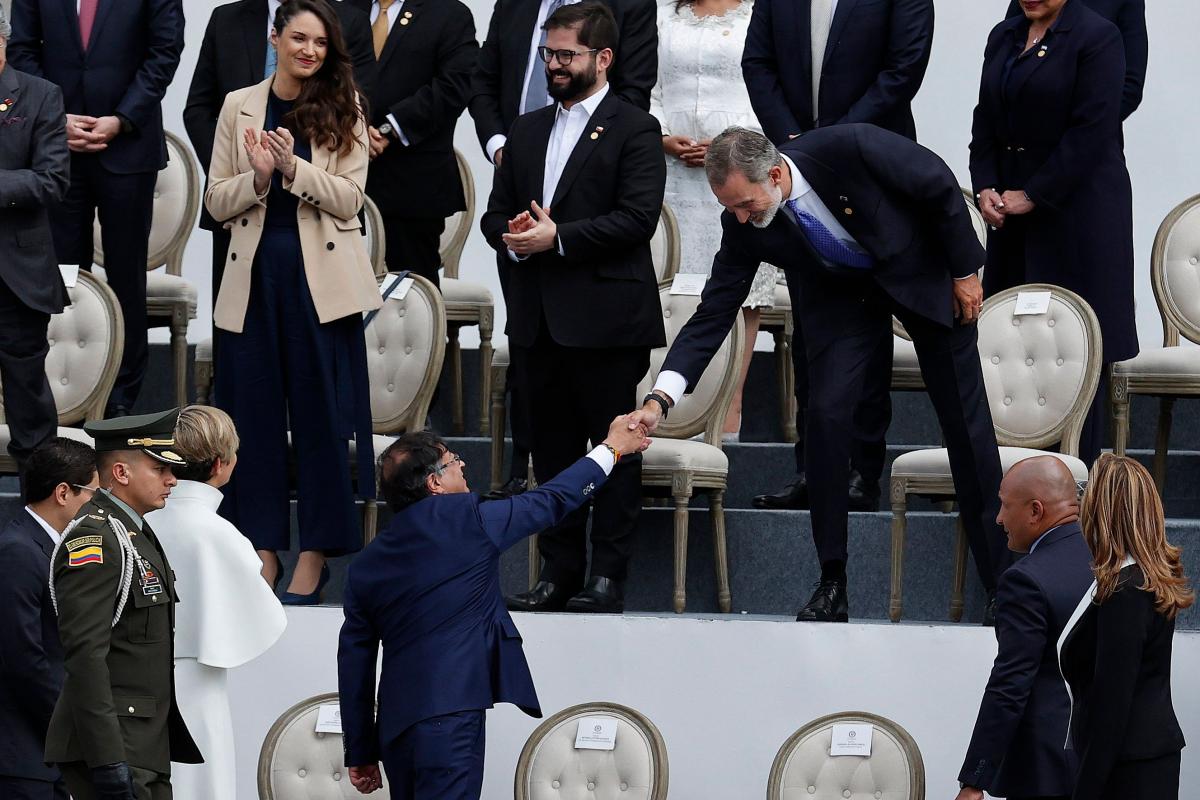 Numerosos usuarios de Twitter no han pasado por alto dos imágenes cargadas de gran simbolismo. La primera de ellas ha sido el saludo que ha brindado el monarca español a Petro, por el que se ha inclinado para poder estrecharle la mano al estar en una posición de altura sobre una grada.