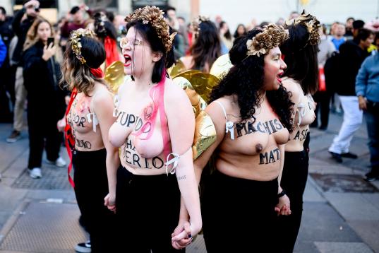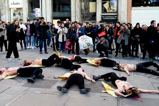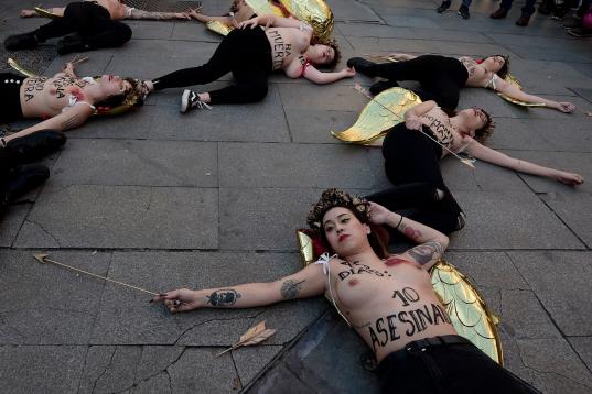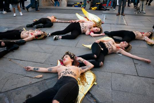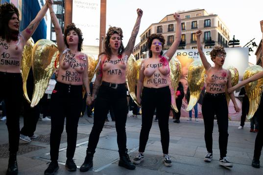 La protesta se ha llevado a cabo por la tarde en el centro de la Plaza de Callao y en la misma las activistas han ejecutado una performance disfrazadas de cupido y con el torso desnudo.