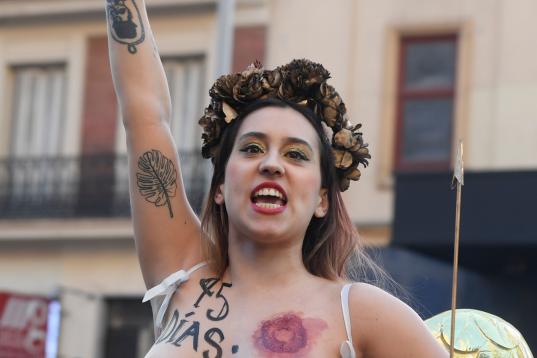 “El amor romántico mata”, “45 días y 10 asesinatos”, “el machismo mata” y “Cupido ha muerto”, son algunas de las consignas que llevaban rotuladas en el torso y, además, han coreado otras como “ayer era amor, hoy es feminicidio” o “ni una menos”.