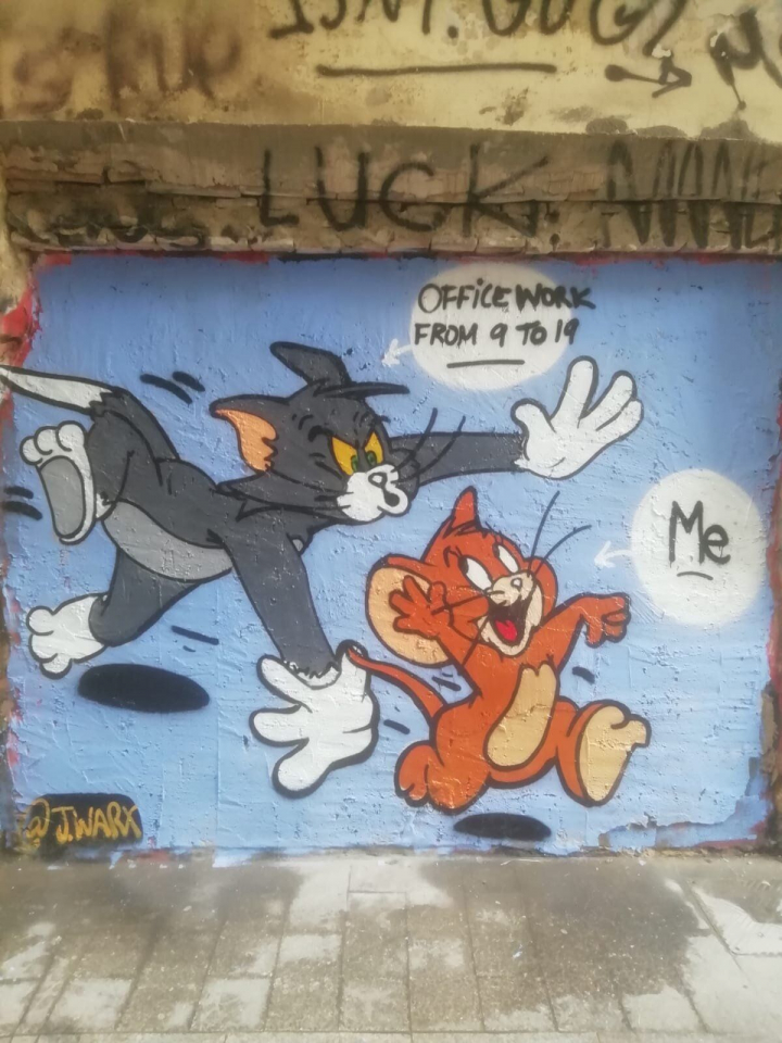 En otro dibujo, por ejemplo, el creador valenciano ilustra a la pareja de dibujos animados Tom & Jerry. En la obra, el ratón, Jerry, intenta escapar de Tom, el gato, y lo compara con la gente tratando de esquivar el horario de oficina de 9:00 a 19:00.