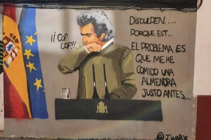 El grafitero valenciano J.Warx es el autor del dibujo de Simón tosiéndose en el codo tras atragantarse con el fruto seco en plena rueda de prensa. “Disculpen... porque est... El problema es que me he comido una almendra justo antes...”, se puede leer en el mural.