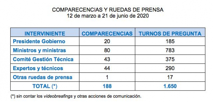 Esto supone casi la mitad de las 188 comparecencias que el Gobierno calcula haber realizado del 12 de marzo al 21 de junio.