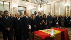 El presidente del Gobierno y la presidenta del Congreso consuelan a la viuda, Pilar Goya.