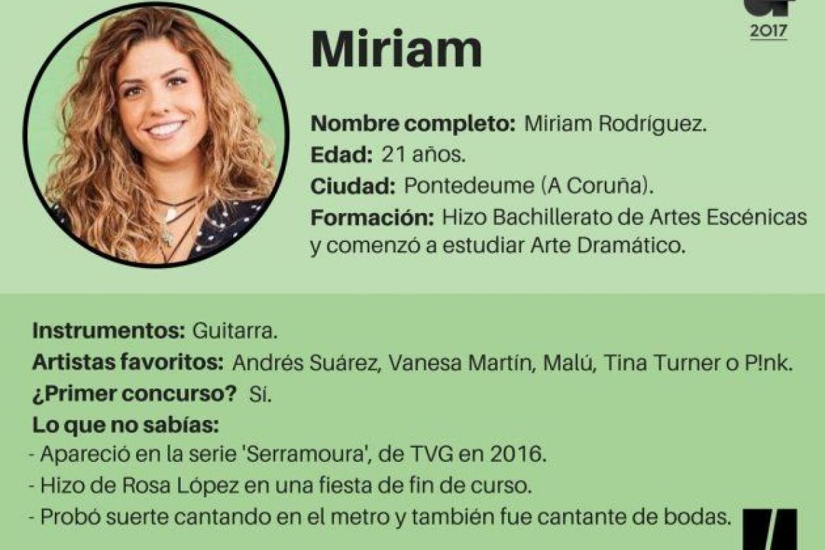 Miriam Rodríguez es una de los cinco concursantes que ha conseguido llegar a la final de Operación Triunfo. La joven, de 21 años y natural de Pontedeume (A Coruña), toca la guitarra y, aunque canta desde muy pequeña, ha contado en varias entrevistas que quiso reservarse para participar en Operación Triunfo y no lo hizo anteriormente en ningún otro reality.