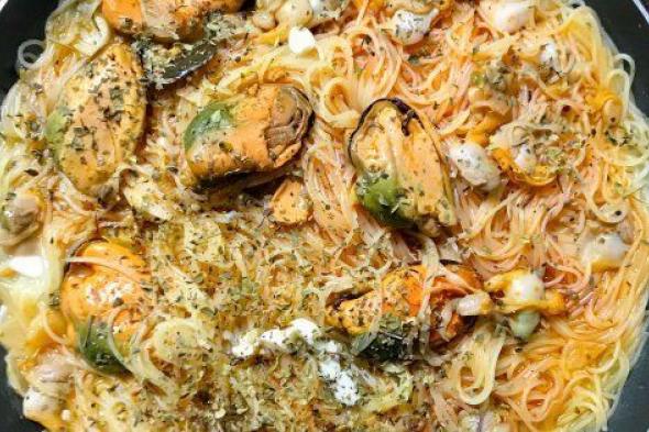 Fideos cabellín con mejillones escabechados y berberechos al natural en conserva