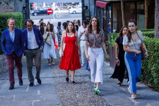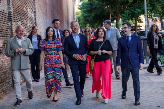 La delegada del Gobierno, Mercedes Rodríguez, el presidente del Senado, Ander Gil, la diputada del PSOE Adriana Lastra y el ministro Félix Bolaños llegando a la fiesta