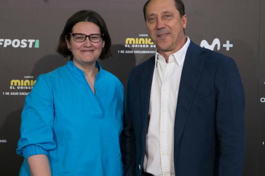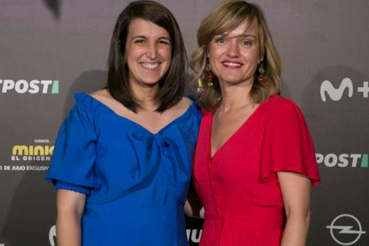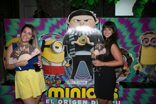 Dos invitadas posan junto al cartel de la nueva película de Los Minions