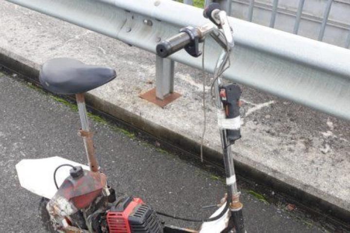El automóvil en cuestión no tiene desperdicio. Se trata de una especie de patinete fabricado por él mismo con el motor y acelerador de una desbrozadora, el depósito de combustible de una mini-moto y el asiento y dirección de una bicicleta.