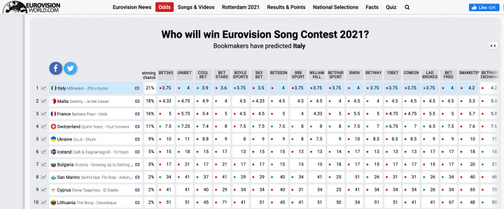 Sí parece probable que Islandia pase la criba de la segunda semifinal y entre en la final, aunque más difícil tiene resultar ganadora. Según resume la web Eurovision World, las casas de apuestas dan como vencedora a Italia, seguida por Malta, Francia, Suiza y Ucrania.