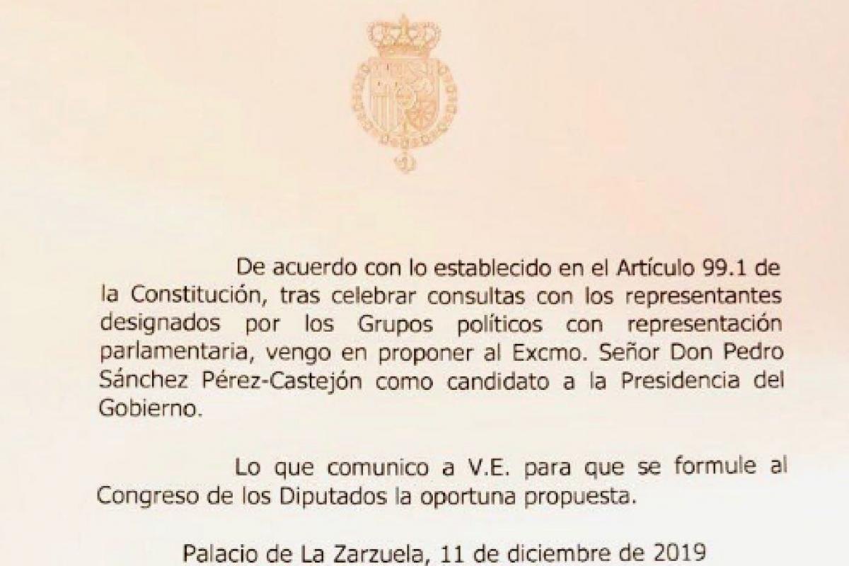 Aparece en el documento en el que Felipe VI propone a Pedro Sánchez candidato.