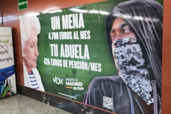 El cartel, que se exhibe en instalaciones de Cercanías Renfe de Madrid, muestra en un lado una anciana y en el otro a un joven inmigrante de piel oscura embozado y encapuchado, con el texto “Un mena 4.700 euros al mes, tu abuela 426 euros de pensión/mes. Protege Madrid, vota seguro”.