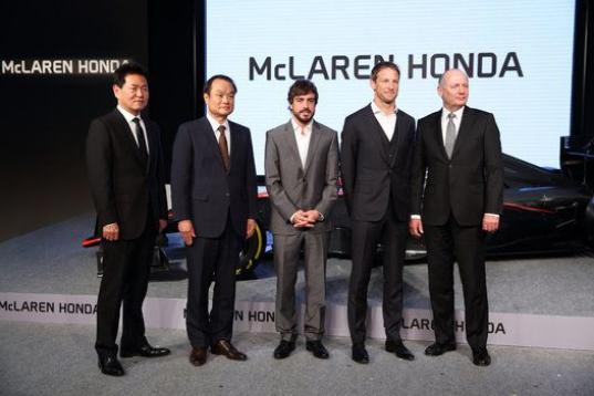 En la presentación de Tokio, Alonso ha posado con los responsables de Honda Yasuhisa Arai y Takanobu Ito, su nuevo compañero y también campeón del Mundo Jenson Button y un viejo conocido de McLaren, Ron Dennis