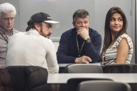 Alonso medita cabizbajo junto a su padre y su novia tras ver cómo su monoplaza no pasaba de los 277,6 km/hora frente a los 307,6 del Williams de Massa y el Mercedes de Rosberg.