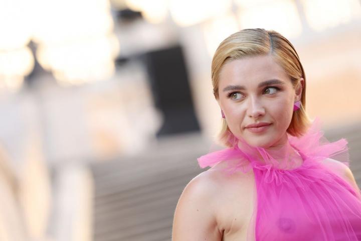 Antes de ponerse el Valentino que tanto dio que hablar, Florence Pugh ya era consciente de la que se le podía venir encima. En julio eligió un vestido de tul rosa largo, con cuello halter adornado con un volante, y tejido transparente que dejaba entrever sus pechos para acudir al desfile de alta costura de la firma en Roma.
