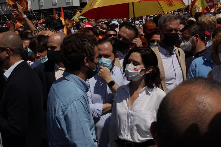 Una manifestación contra Pedro Sánchez… pero que ha mostrado a unas derechas sin ganas de encontrarse. O más bien, evitándose. El líder del PP, Pablo Casado, ni siquiera ha pisado la plaza de Colón, para evitar cruzarse, saludar y retratarse con el presidente de Vox, Santiago Abascal. El ‘popular’, se ha quedado muy, muy, muy lejos del escenario. Apenas ha bajado unos metros la calle Génova -sede del PP- para hacer campamento en la confluencia con la calle de Recoletos, en el asfalto. Nada de entrar dentro de la plaza de Colón.