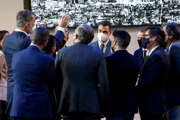 El más alto de todos por la izquierda de la imagen es Felipe IV, rey de España. De frente, vemos al presidente del Gobierno, Pedro Sánchez, atento como el resto de los presentes a lo que está diciendo el monarca, que hace un gesto con la mano derecha.