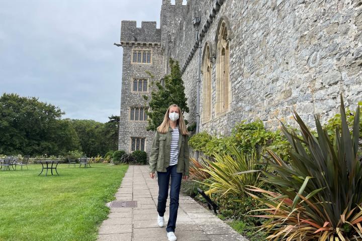 La Casa Real ha distribuido las primeras imágenes de la princesa de Asturias en el castillo de Saint Donat, donde se ubica el centro —al que el Daily Mail apoda el Hogwarts hippie—. Con la misma ropa con la que se la vio en el aeropuerto (vaqueros, una camiseta de rayas y una cazadora verde de Mango), Leonor ha posado caminando por los jardines de su nuevo hogar.